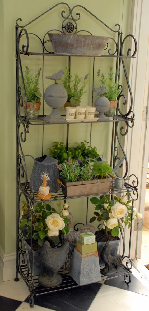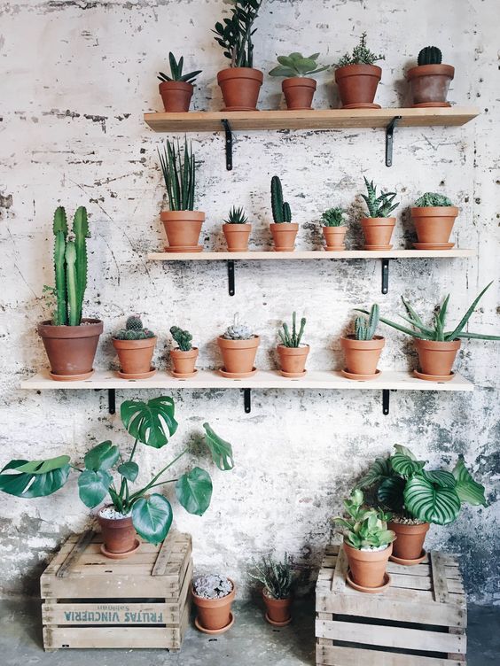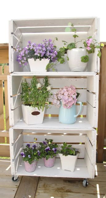 Vamos con otras ideas, que son estanterías, estantes o incluso escaleras viejas de madera o sea, todo lo que pueda tener baldas para poner nuestras distintas plantas o flores.