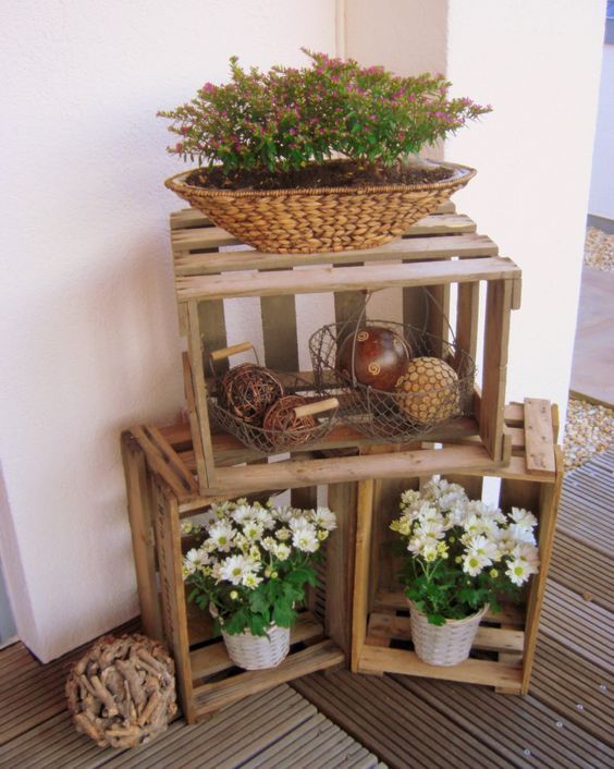 CAJAS DE FRUTAS: también está muy de moda en estos tiempos, lo mismo que los pallets, permiten muchas y variadas decoraciones; se pueden colgar en la pared o simplemente a ras de suelo, se pueden montar una encima de otra tipo estantería