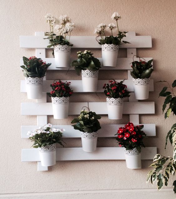 Soluciones hay para todo y para todos; si no queréis o no podéis disponer de flores o plantas naturales, siempre tenéis la opción de la primera foto: pintar piedras imitando cactus que tan de moda están y llenan de verde cualquier rincón y si luego ponéis algún toque dorado, pues os quedará genial. Mirad la segunda foto, un color cálido para la pared que siempre le da otro toque, un banco lleno de piedras y con telas alegres y monas y macetitas colgadas y en los rincones, con muy poquito qué mono queda ¿no creeis? Otra opción, las jaulas que me parecen divinas de la muerte, se pueden colgar con flores dentro, con lucecitas, se pueden poner varias de distintos tamaños sobre una estantería….una maravilla de opciones, vaya. Y mirad la última foto, el resultado es alegría no? y no tiene nada, ruedas y pallets…