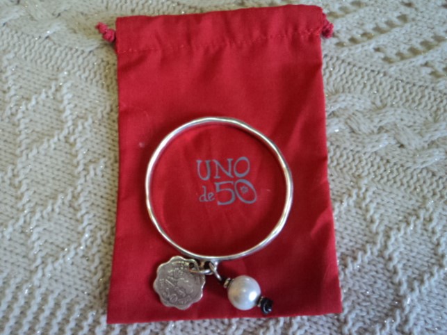 Es original y para mi la perfecta pulsera, porque reúne las condiciones que me privan en las pulseras: es rígida, plateada, tiene una perla, que adoro las perlas, y suena cuando mueves la mano, ¡lo tiene todo!