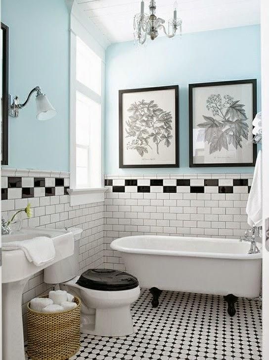 En principio, sugiero pintar los azulejos; hay una pintura maravillosa que consigue cambios espectaculares y disimula todas las imperfecciones de los azulejos antiguos. Se puede optar por pintura lisa o a rayas, incluso hay papel pintado perfecto para baño; sugiero pintar o decorar sólo una pared para no cargarlo mucho.