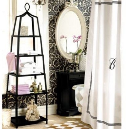 Respecto a los muebles auxiliares, hay muchas variedades. Me encantan las estanterías en forja negra, son ligeras porque no abultan mucho, son decorativas porque por sí mismas aportan mucho toque y son útiles porque se pueden utilizar para toallas, objetos decorativos o simplemente con cajitas a juego o con cestas de mimbre. Otra opción son las cajitas tipo fruta o tipo pallet trabajado, que son estupendas para usarlas como decoración sobre todo cuando empiezas con una primera casa y los presupuestos están muy ajustados. Quiero hacer especial mención a sugerencia de usar cortinas para el baño; no soy muy amante de las mamparas, no me parecen lo más práctico del mundo, siempre hay que tenerlas bien bien limpitas para que luzcan, así que sugiero el uso de cortinas; lo podéis ver en la segunda foto, simple y sencilla con la inicial bordada, hay muchos modelos divertidos o serios, se lavan perfectamente y quedan estupendas y cuando se gaste o se ponga fea, cambiamos ya que no es un coste muy elevado; siempre se puede poner lisa y decorarla por ejemplo con flores sueltas.