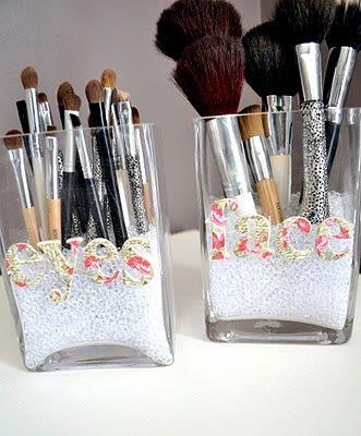 Como se lleva tanto la decoración vintage, se pueden buscar láminas de este tipo por ejemplo en el rastro de Madrid y podemos enmarcarlas para darle más importancia o pegarlas sobre un lienzo y quedarán estupendas; mirad la de los botes antiguos en negro ¿¿¿a qué es divina??? Y mencionaros también, el detalle cuco si tenéis muchas brochas cómo queda de bien sobre un cristal con piedras o arena.
